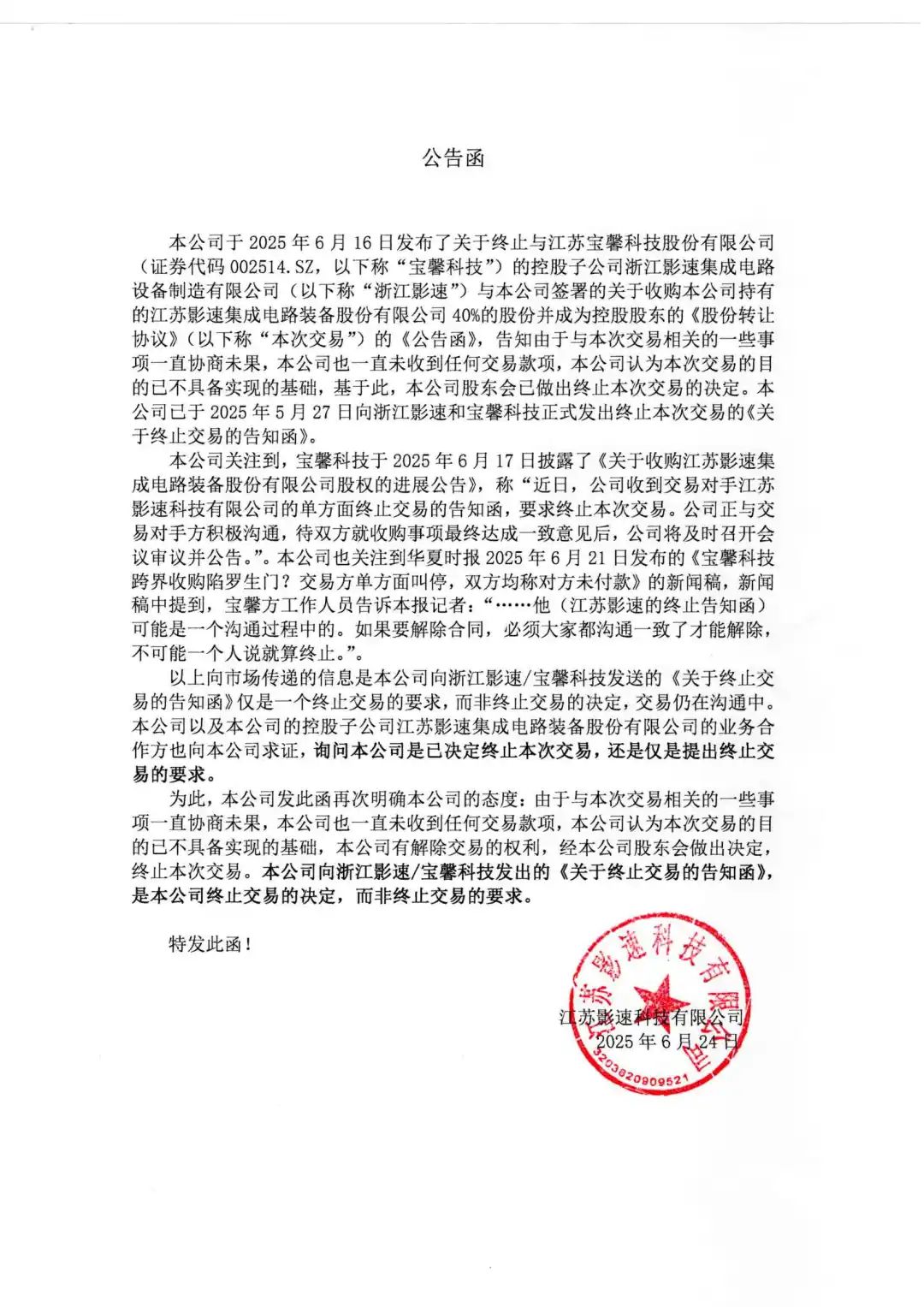控股股東影速科技已終止與寶馨科技(證券代碼002514.SZ)的控股子公司浙江影速關于收購本公司40%股份的交易